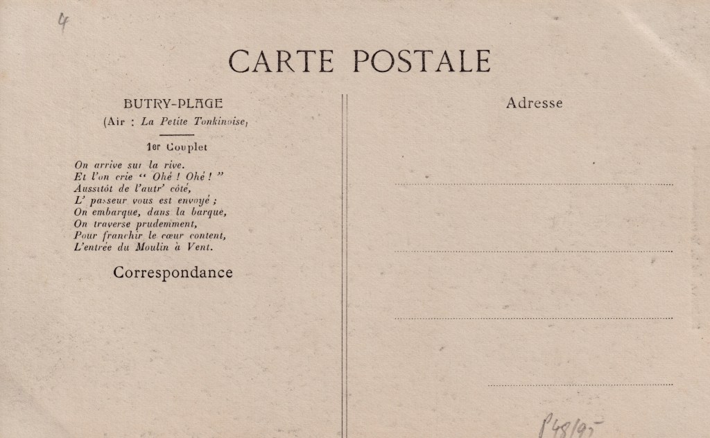 La chanson de Butry-Plage se chante sur l’air de la Petite Tonkinoise, composée en 1906 par Vincent Scotto sur des paroles d’Henri Christiné, un grand succès de la Belle Epoque repris en 1930 par Joséphine Baker. La partition avec les paroles est distribuée aux clients qui veulent chanter, pratique courante au début du vingtième siècle.