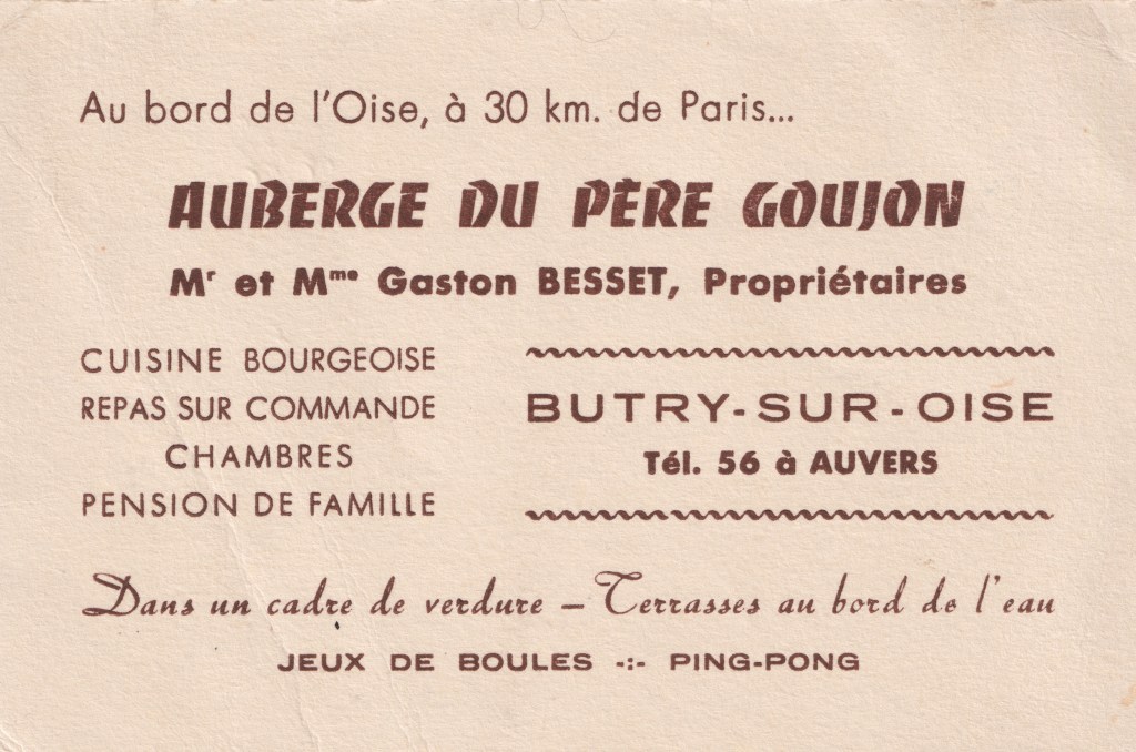 Je suis avec le cousin et la cousine Gourlay et Melle Louise Cordey à Butry-Plage, pays charmant situé sur les bords de l’Oise. Notre voyage en auto s’est fort bien passé. Nous avons quitté la Porte Maillot à 8 heures 15 et à 15 heures moins le quart, nous étions arrivés à destination. Il fait un temps idéal ! Qu’il doit faire bon à Port-Mahon !