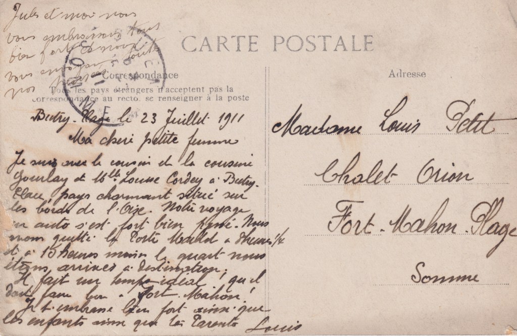 Le 23 juillet, Louis Petit écrit à sa jeune épouse en vacances chez ses parents dans la Somme avec leurs enfants, juste après son arrivée en voiture à Butry-Plage à l’auberge du père Goujon.