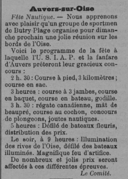 Fête Nautique. – Nous apprenons avec plaisir qu’un groupe de sportmen de Butry-Plage organise pour dimanche prochain une jolie réunion sur les bords de l’Oise. Voici le programme de la fête à laquelle l’U.S.I.A.P. et la fanfare d’Auvers prêteront leur gracieux concours :