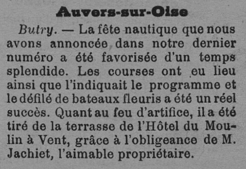 Butry. – La fête nautique que nous avons annoncée dans notre dernier numéro a été favorisée d’un temps splendide. Les courses ont eu lieu ainsi que l’indiquait le programme et le défilé de bateaux fleuris a été un réel succès. Quant au feu d’artifice, il a été tiré de la terrasse de l’Hôtel du Moulin à Vent, grâce à l’obligeance de M. Jachiet, l’aimable propriétaire.«