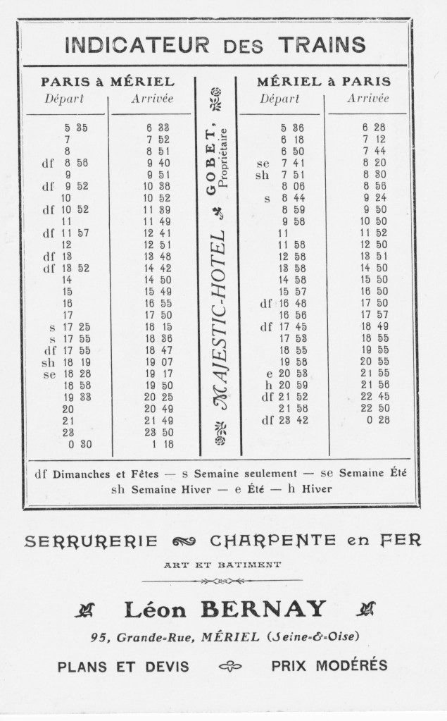 L’hôtel apparaît comme un bâtiment un peu prétentieux, désireux d’attirer une clientèle plus bourgeoise que celle qui fréquente les guinguettes de la rive de Butry. Il distribue des cartes avec les horaires de train pour venir de la Gare du Nord à Mériel.
