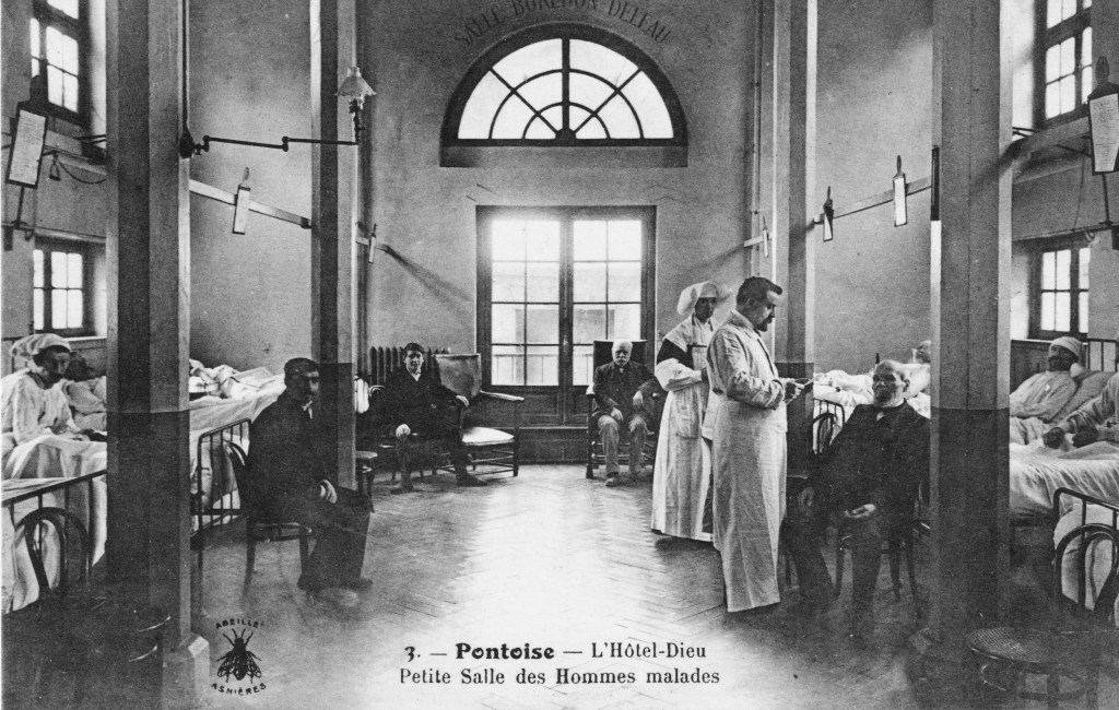A la Belle-Epoque, les malades des villes des bords de l’Oise n’ont accès qu’à un seul hôpital : l’Hôtel-Dieu de Pontoise. Construit sous Saint-Louis en 1258, l’Hôtel Dieu est en activité jusqu’à la première guerre mondiale durant laquelle il a accueilli de nombreux blessés.