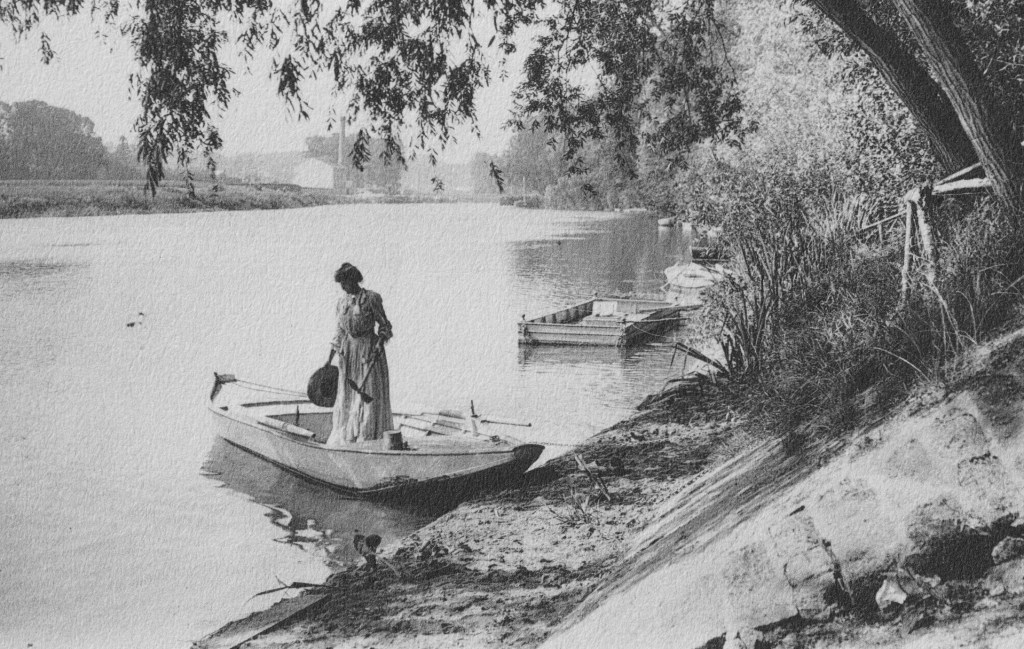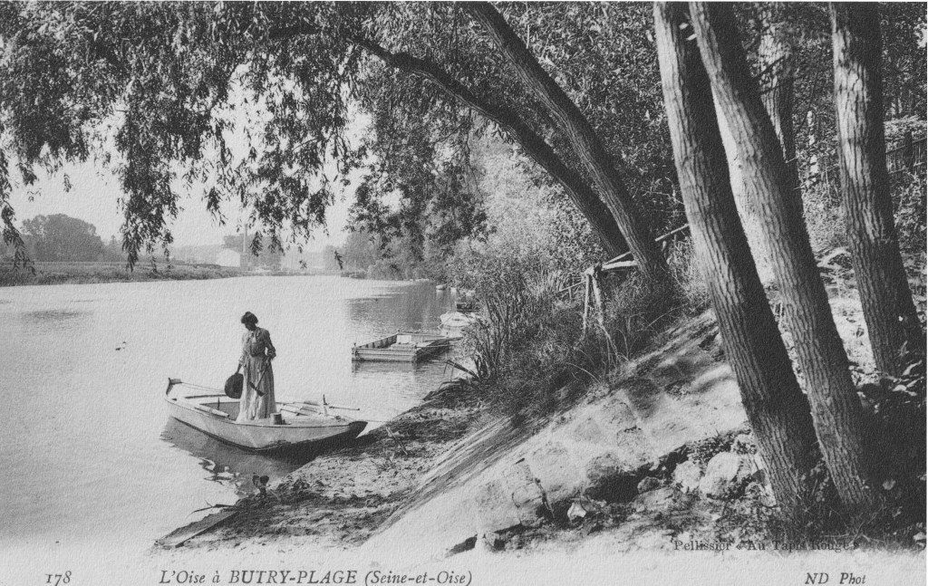 Les rives de l’Oise n’ont pas changé. Seules la tenue de la femme à bord de la barque qui l’a portée de Mériel à Butry-Plage permet de situer l’image au début du XXème siècle.