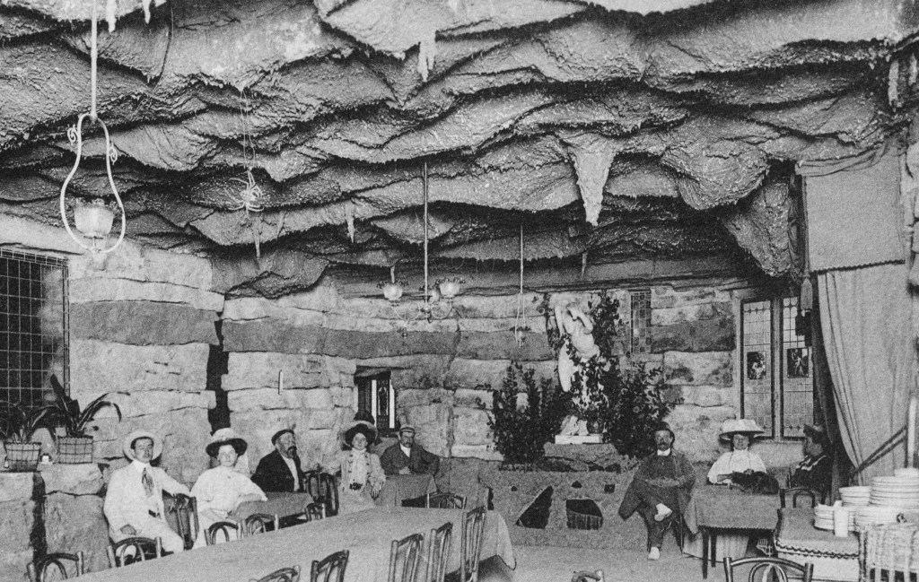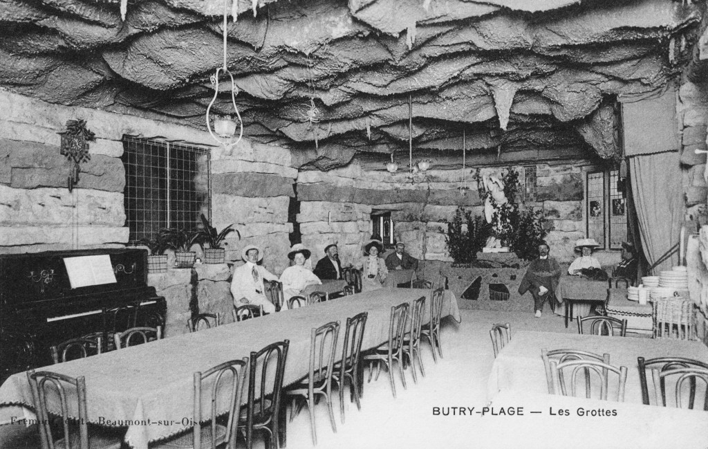 En journée l’été, les clients restent en terrasse. Mais en cas de mauvais temps et en soirée, il est possible de déjeuner dans la salle de restaurant qui abrite une fausse grotte dans le style architectural des Buttes-Chaumont.