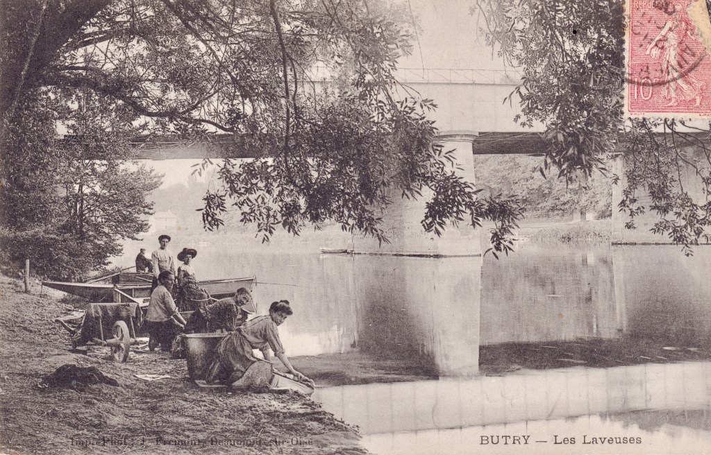 A Butry-Plage, aucun lavoir n’existait. Les laveuses travaillaient dans des conditions rudimentaires tout près du pont de chemin de fer, juste à côté de la guinguette du Moulin à Vent.