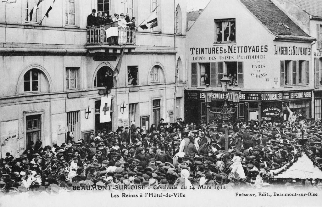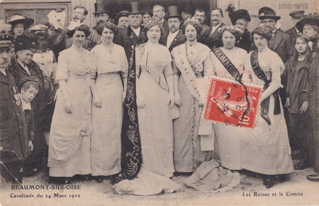 Comme chaque année lors de la cavalcade de Carnaval, la ville de Beaumont-sur-Oise élit ses reines de beauté. Les photos de la cavalcade du dimanche 24 mars 1912 ont été éditées en cartes postales.