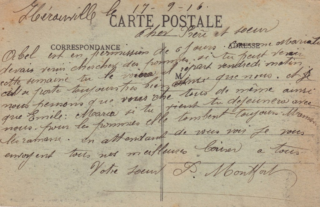 Abel est en permission de 6 jours. Cousine Mariette devait venir chercher des pommes. Si tu peux venir cette semaine, tu le verras. Il repart vendredi matin. Il se porte toujours très bien, ainsi que nous. Et nous pensons que vous êtes tous de même ainsi qu’Emile.«