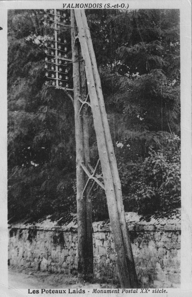 A l’époque, les communications téléphoniques requièrent des fils et des poteaux. Les poteaux téléphoniques plantés à Valmondois dans les années 30 suscitent le rejet et les moqueries, un peu comme aujourd’hui l’installation des hélices éoliennes dans certaines campagnes. Une carte postale est même éditée : on y voit un poteau téléphonique, avec ses isolateurs en porcelaine. La légende indique « Les Poteaux Laids – Monument Postal XXe siècle ».